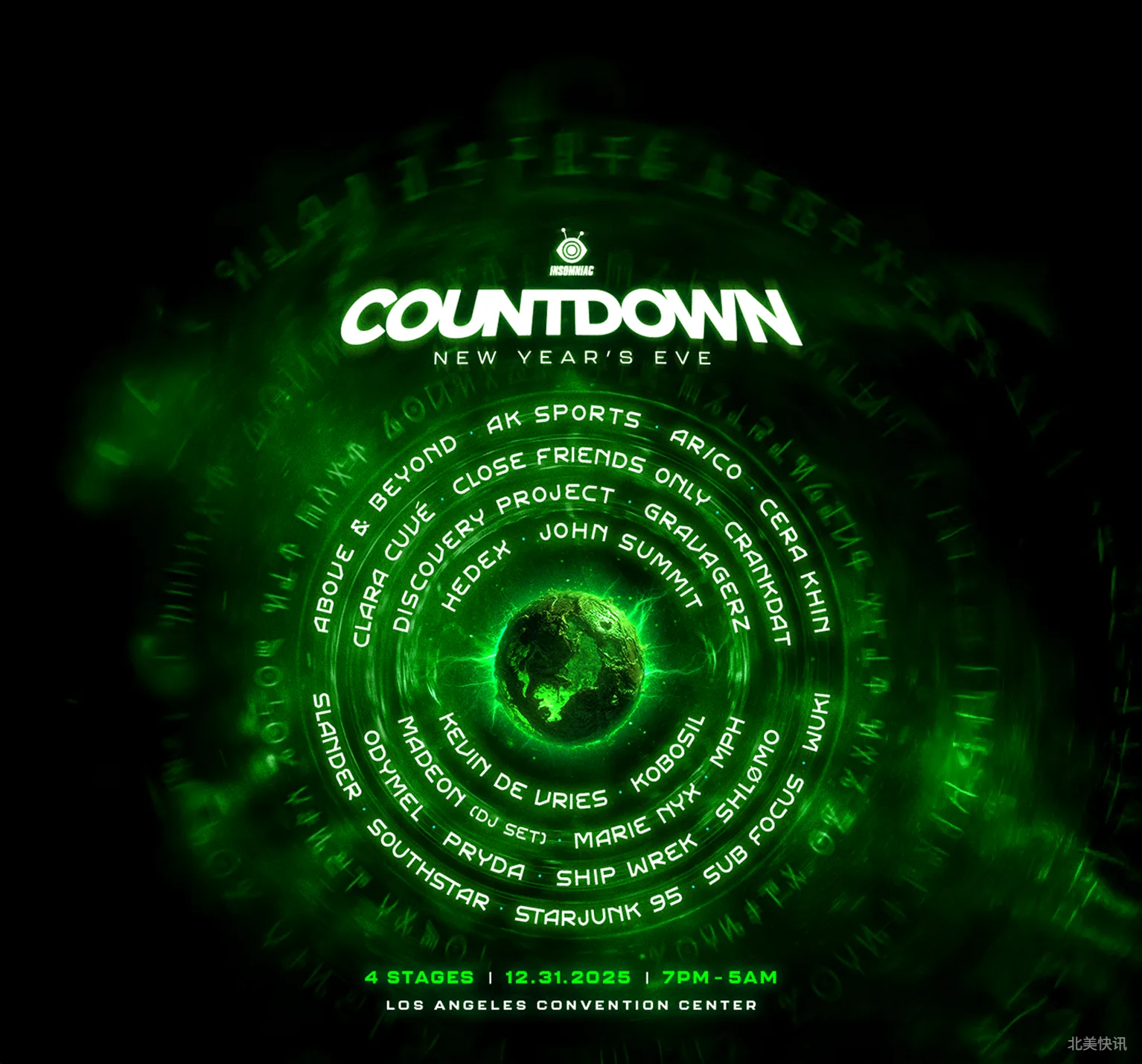 活动详情-Event details:全新的倒计时世界登陆洛杉矶市中心!你最爱的星际派对重返室内,在洛杉矶会展中心打造4个超棒的舞台,配备全温控系统,并以全新布局呈现。新年夜见!