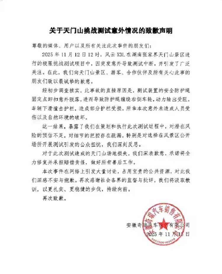 事故发生后,奇瑞汽车迅速响应,于 11 月 13 日凌晨发布官方致歉声明。声明中披露,事故直接原因是测试装置的安全防护绳固定点卸扣意外脱落,脱落的防护绳缠绕右侧车轮,导致车辆动力输出受阻,最终下滑撞击护栏,造成部分护栏受损。同时,奇瑞也坦诚承认 “对潜在风险的预估不足,对细节的把控存在疏漏”,并承诺将全力修复受损设施、承担全部赔偿责任,做好善后工作🚨。