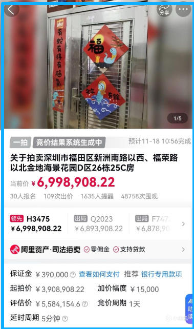 今年 10 月底,福田法院重启该房产的拍卖程序,起拍价定为 390.8 万元,远低于首次拍卖的成交价。低廉的价格迅速吸引了市场关注,共有 30 名购房者参与竞拍,经过多轮加价角逐,最终以 699.8 万元落槌成交。核算下来,该房产单价约 5.34 万元 / 平方米,不仅比首次成交价低了 140 万元,更较目前福田区 8—10 万元 / 平方米的二手房均价便宜近五成,价格优势极为明显。