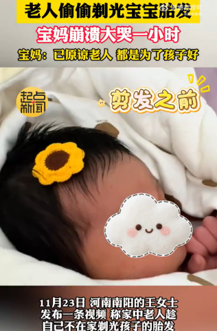 “出门不到20分钟,宝宝的胎发就没了!”王女士发布的视频中,刚满50天的宝宝头顶光秃秃的,而奶奶站在一旁面露委屈。王女士在视频中解释,自己一直反对给新生儿剃胎发,担心锋利的工具损伤宝宝娇嫩的毛囊,但奶奶坚持老一辈说法,认为胎发不剃会影响健康,容易让孩子生病。情绪激动的王女士崩溃大哭近1小时,网友们对此看法不一,有人共情王女士的担忧,也有人理解奶奶的传统心意,相关话题迅速登上社交平台热议榜。