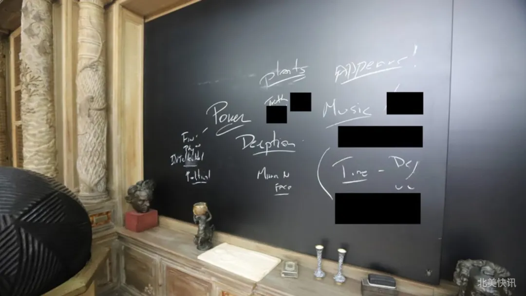 空间布局:卧室、会客区、陈列室、疑似办公室(黑板写有“金融”“欺骗”“权力”等词)