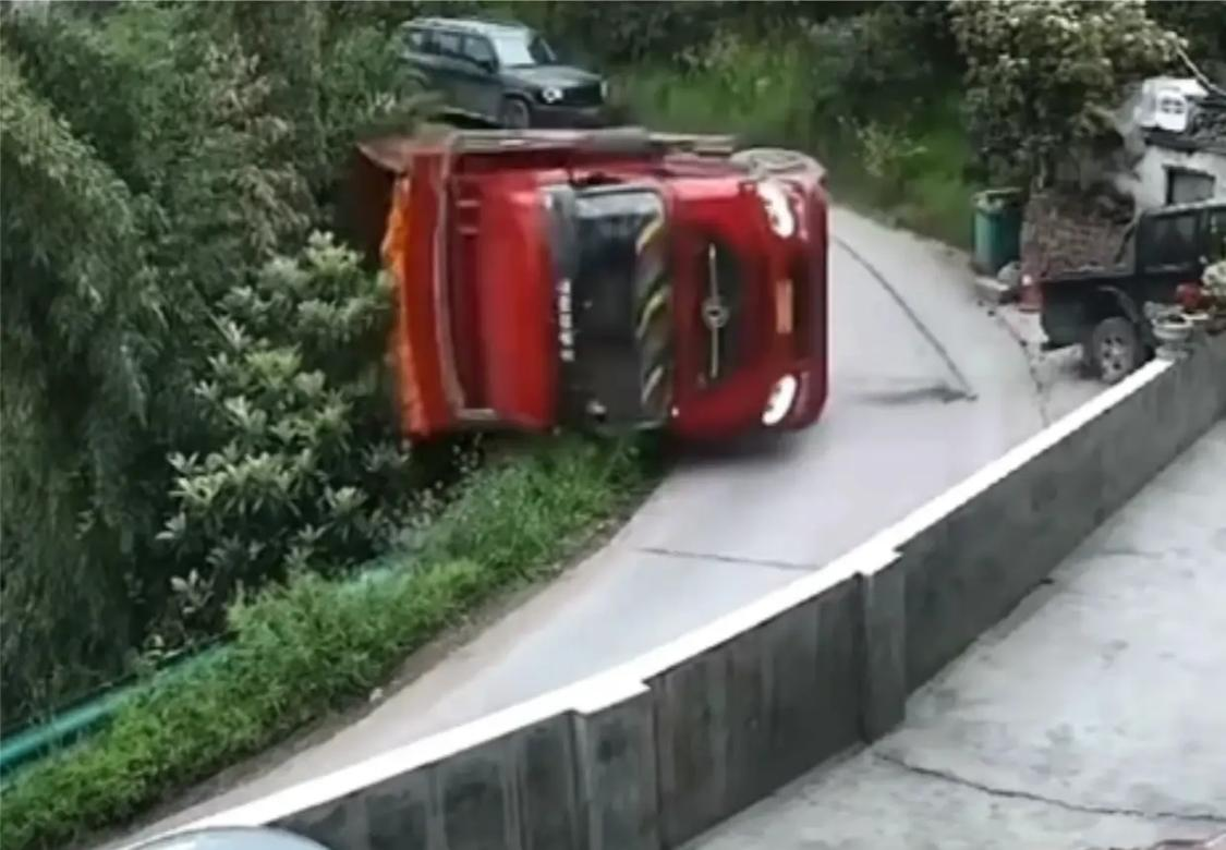 现场监控画面记录下了这惊魂一幕:货车行驶至弯道时,车尾突然剧烈甩动,随即整个车身失去控制,冲出路基,沿着约30米高的陡峭山坡连续翻滚数圈,最终重重地卡在崖底的树木之间。巨大的冲击力导致车厢严重损毁,车上装载的约2万斤新鲜橙子瞬间如瀑布般倾泻而出,金灿灿的果实散落在山坡的岩石和草丛之间,场面一片狼藉,令人揪心。