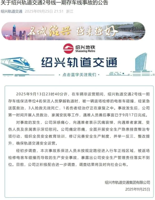 2025年9月13日23时40分许,在车辆非运营期间,绍兴轨道交通2号线一期存车线保洁单位4名保洁人员穿越轨道时,被一辆返场检修的电客车碰撞,经紧急送医救治,3人抢救无效死亡,1名伤者经治疗正在康复之中。事故发生后,公司第一时间开展人员救治、家属安抚等工作,遇难人员善后事宜已于9月17日完成。