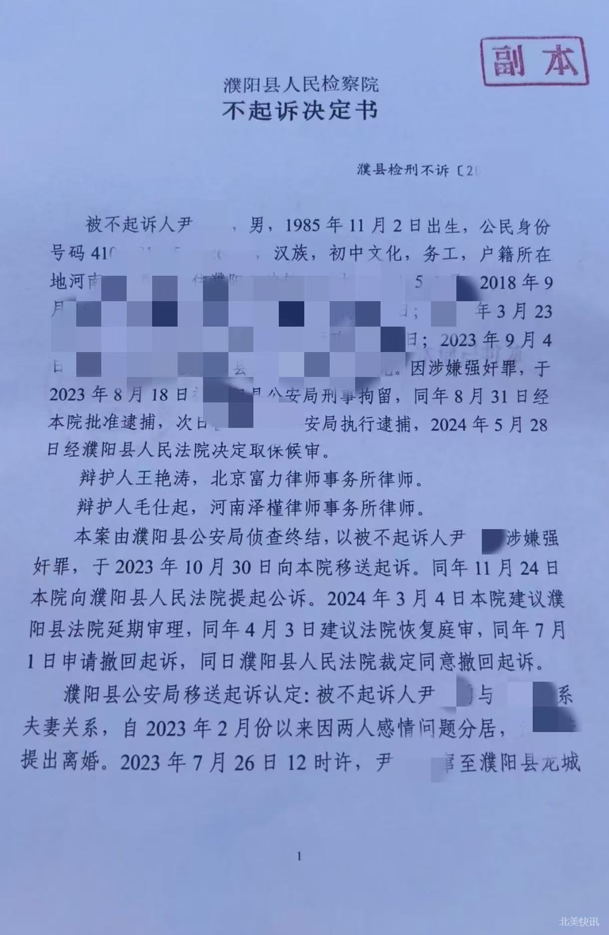离婚诉讼受挫后,事件在 2023 年 7 月 26 日迎来剧烈反转。当天中午 1 时 20 分,武女士报警称被丈夫尹先生强奸,自述上午 11 时回家后遭尹先生抱进卧室掌掴、卡脖,随后被侵犯长达半小时至 1 小时,事后跑到阳台呼救并意图报警,最终光脚披发逃到邻居家求救,邻居证实其当时 “浑身发抖、不停哭泣”😨。警方调查中,尹先生辩解称,当日上午他刚参加完此前 2 月家暴行政处罚案的行政复议开庭,回家后想和武女士谈离婚事宜,因发现对方干呕且两人已数月无亲密关系,怀疑其出轨,争执中仅 “将对方压身下吸了脖子五六下并拍视频”,并未发生关系,直指武女士是为快速离婚分财产而 “构陷”。值得一提的是,2023 年 2 月尹先生曾因婚姻纠纷殴打武女士致轻微伤,被行政拘留 3 日,他对此仍不服并申请复议。8 月 18 日,濮阳县公安局对武女士被强奸案刑事立案,尹先生当日被刑拘,9 月 1 日经检方批准逮捕。然而案件办理中,关键证据出现矛盾:鉴定显示武女士的衣物、身体均未检出精斑,与她所述 “多次侵犯” 的说法相悖🧐。2024 年 3 月检方建议延期审理,4 月恢复庭审,5 月 28 日尹先生被取保候审。期间的 4 月,尹先生称自己在看守所 “稀里糊涂” 签下离婚协议:父母全款购买的房产归武女士,约 14 万外债(含 6 万多夫妻共同借贷、武女士婚内自行借贷 8 万多)由他承担,大女儿归武女士抚养,儿子和小女儿归他。7 月 1 日,检方以 “现有证据不足,达不到起诉条件” 申请撤诉,法院当日裁定同意,7 月 31 日检方出具不起诉决定书,此时尹先生已被羁押 285 天。