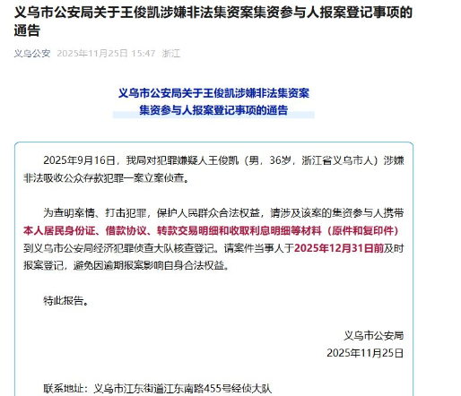 11月25日,义乌市公安局通过官方渠道发布案件通报,核心信息显示:犯罪嫌疑人王俊凯,男,36岁,浙江省义乌市本地人,其涉嫌非法吸收公众存款犯罪一案,警方已于2025年9月16日正式立案侦查。为全面查明案情、依法打击犯罪,切实保护集资参与人的合法权益,通报明确了报案登记的具体要求。