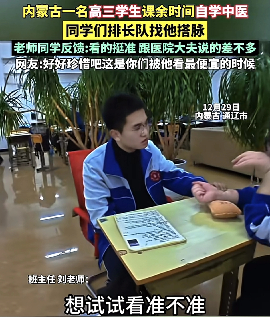 近日,内蒙古通辽市一名高三男生凭借课余自学的中医技能走红校园。“没想到我们身边就有‘小中医’,把脉特别认真,说的症状也都对得上!”提起这位高三男生,同校同学纷纷点赞。据了解,该男生对中医有着浓厚的兴趣,并未接受过系统的专业培训,所有中医知识都是利用高三紧张学习之余的碎片化时间自学而成。从基础的中医理论典籍,到实操性极强的把脉技巧,他都逐一钻研,慢慢摸索出了一套自己的诊断方法。