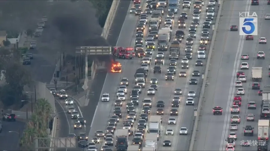 就在这时,一辆被困在车流中的车 突然起火,地点在 Terra Bella Street出口附近的最右侧车道。