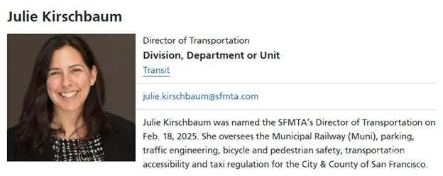 旧金山运输主管寇淑宝Julie Kirschbaum推行防逃票、换新车、装测速摄像头等改革,2026年需争取选民资金缓解赤字。