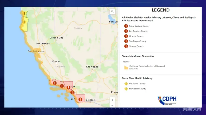 加州公共卫生部 (CDPH) 本周发出警告,称在南加水域的双壳贝类(贻贝、蛤蜊、牡蛎和扇贝)中检测到了危险水平的生物毒素