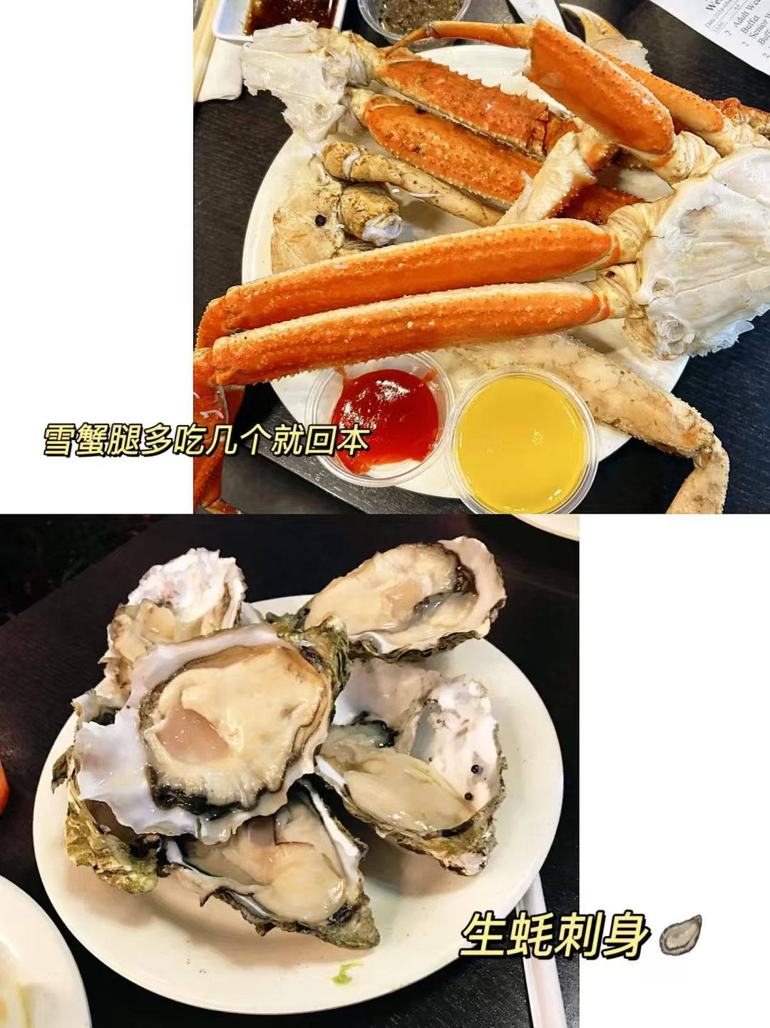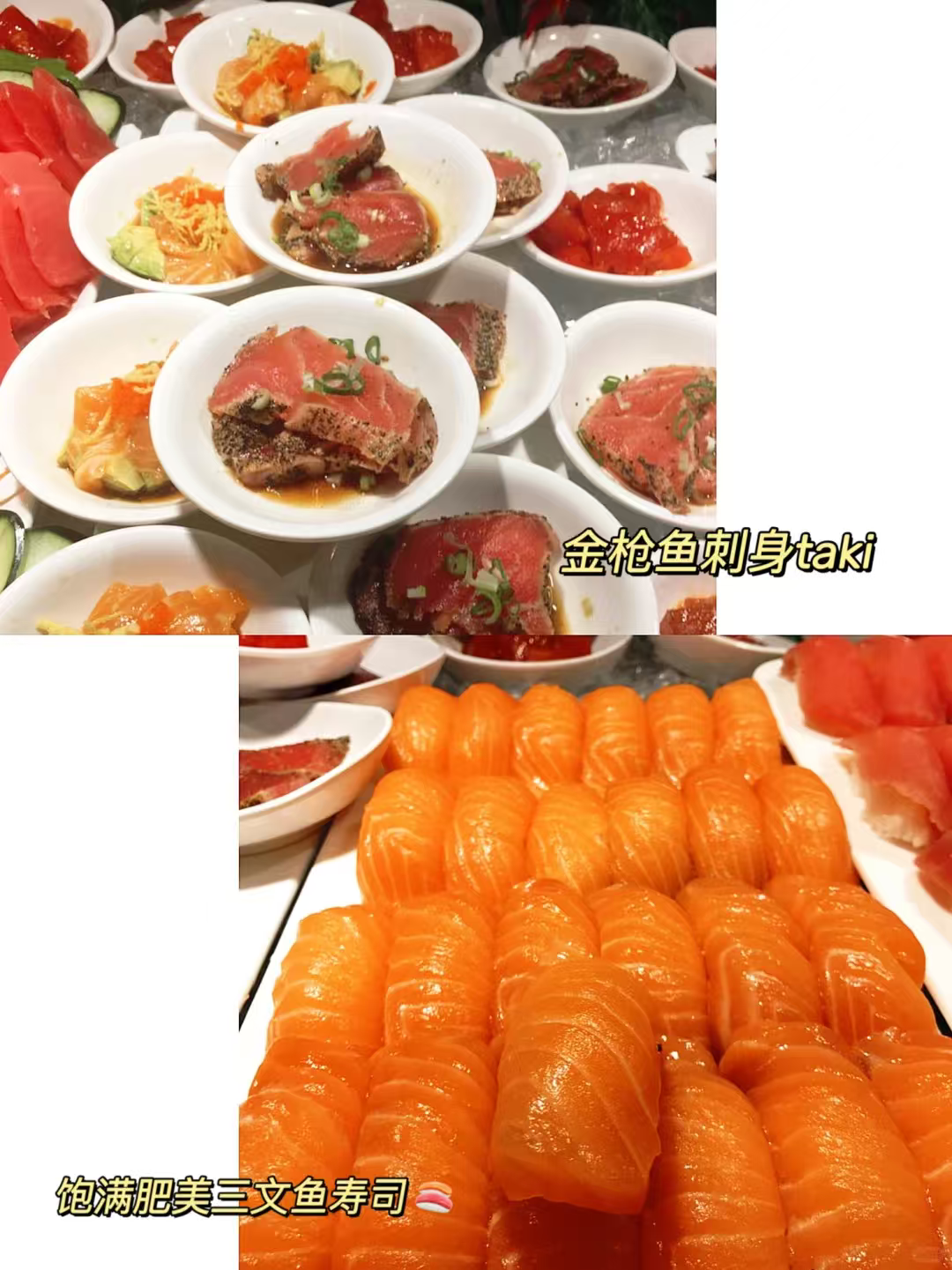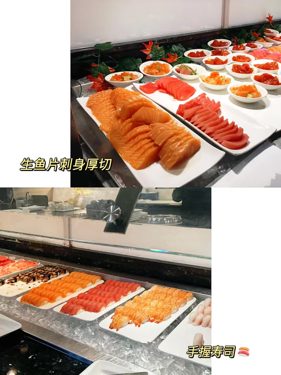 💲午餐20.99、晚餐31.99、周末34.99,雪蟹腿+厚切三文鱼刺身只在晚餐供应哦~雪蟹腿新鲜肥美,一上架就被秒空,但补货超快,吃几个就回本!三文鱼切得超厚,色泽油润,入口即化,金枪鱼、鲷鱼同样新鲜爆表✨。